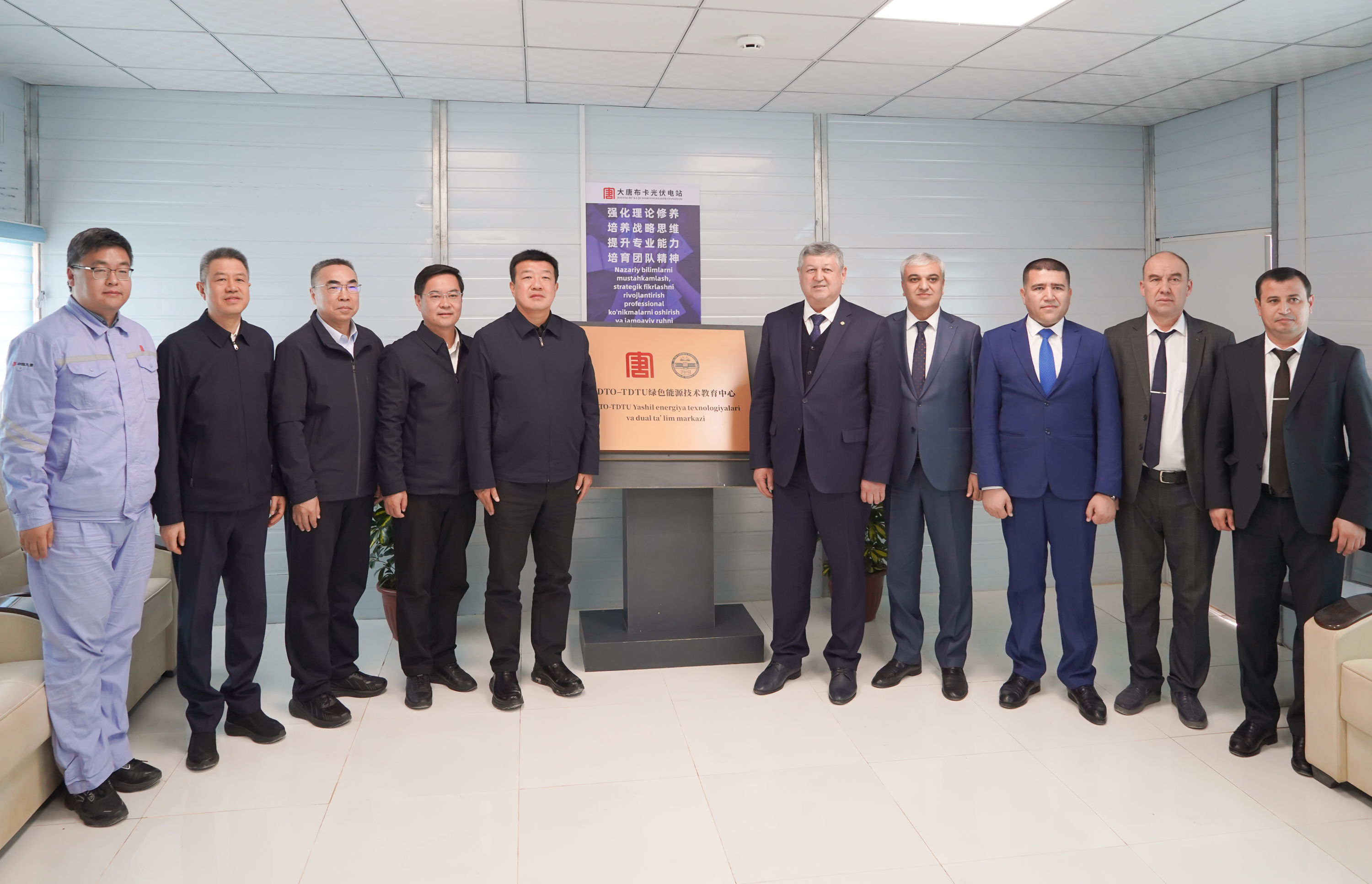 調(diào)研期間,呂軍在布卡光伏項目現(xiàn)場,與塔什干國立技術(shù)大學(xué)校長、院士薩德里丁·馬哈馬托維奇舉行會談,并共同為“大唐海投-塔什干國立技術(shù)大學(xué)綠色能源技術(shù)教育中心”揭牌。該技術(shù)教育中心后續(xù)將為塔什干國立技術(shù)大學(xué)畢業(yè)生提供實習(xí)實訓(xùn)機會,助力烏茲能源電力人才培養(yǎng)。