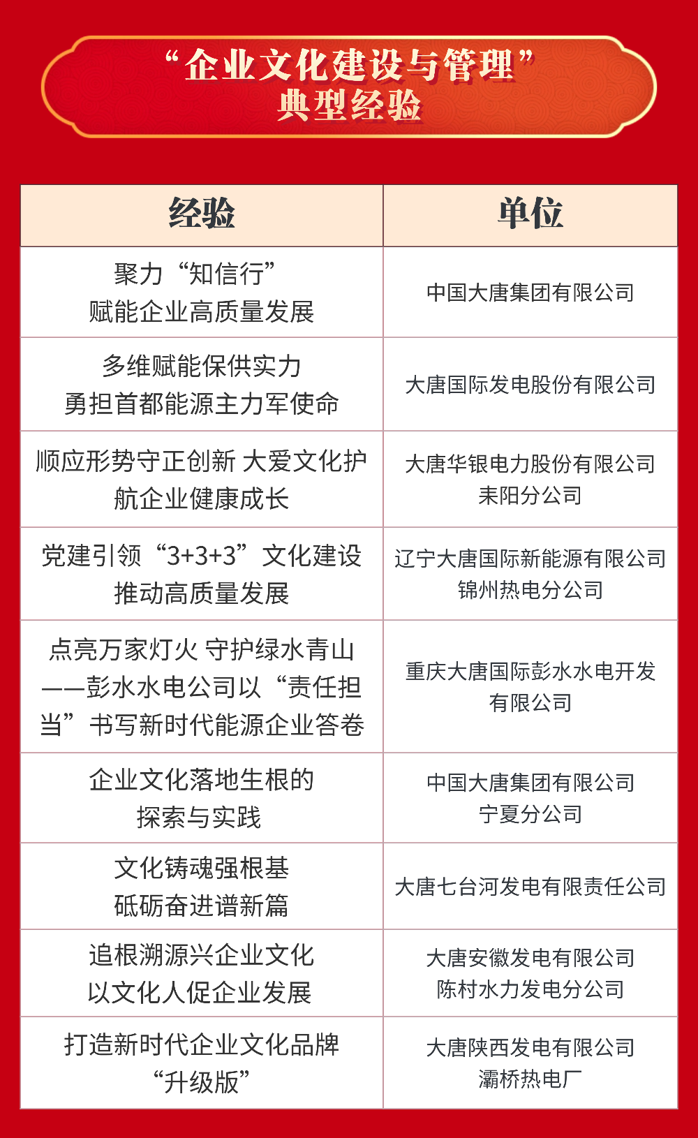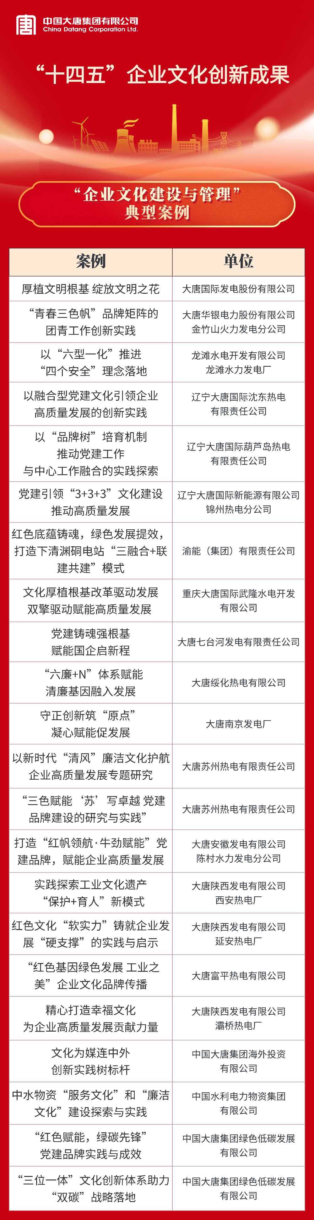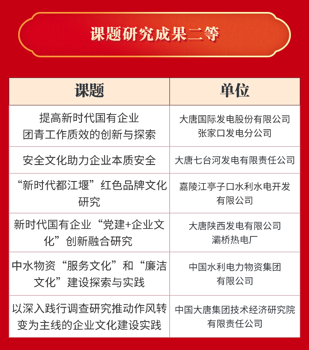 大唐國際發電股份有限公司等22家單位獲評“十四五”企業文化建設與管理典型案例;中國大唐及所屬8家單位獲評“十四五”企業文化建設與管理典型經驗;中國大唐及所屬5家單位獲評課題研究成果一等;大唐國際發電股份有限公司張家口發電分公司等6家單位獲評課題研究成果二等。具體名單如下: